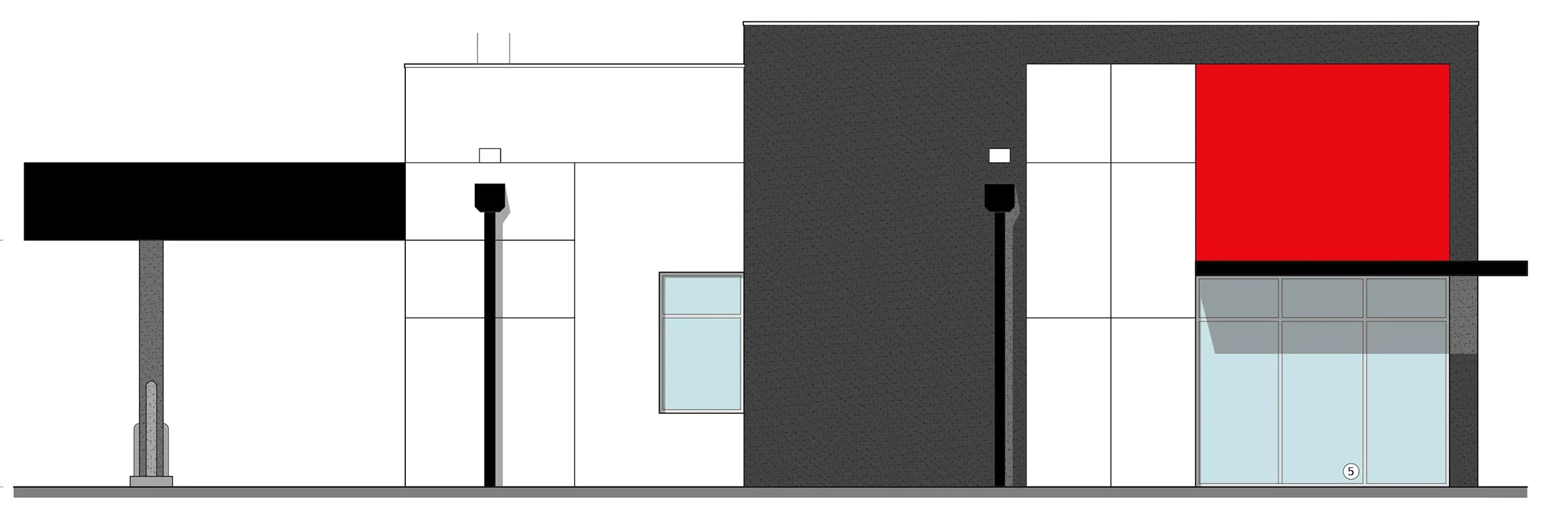 Back-of-House: The rear of the bulding brought one of it’s main functions to the forefront. The importance of serving the heavily trafficked drive-through was greater than the “foot-traffic” up front. A teller window, an ATM, a night-deposit box, and a vacuum air tube (VAT) were provided for the two lanes. Coordinaiton with Civil was crucial on this east side of the builing, as the sizes and radii of the drives directly affected building placement and parking on the west and south sides.
